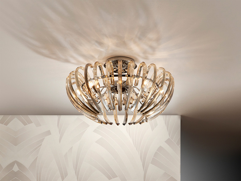 Plafonnier à 9 lumières fait en métal finition chrome. Tulipe formée par des barres courbes en verre de grande qualité de couleur champagne.