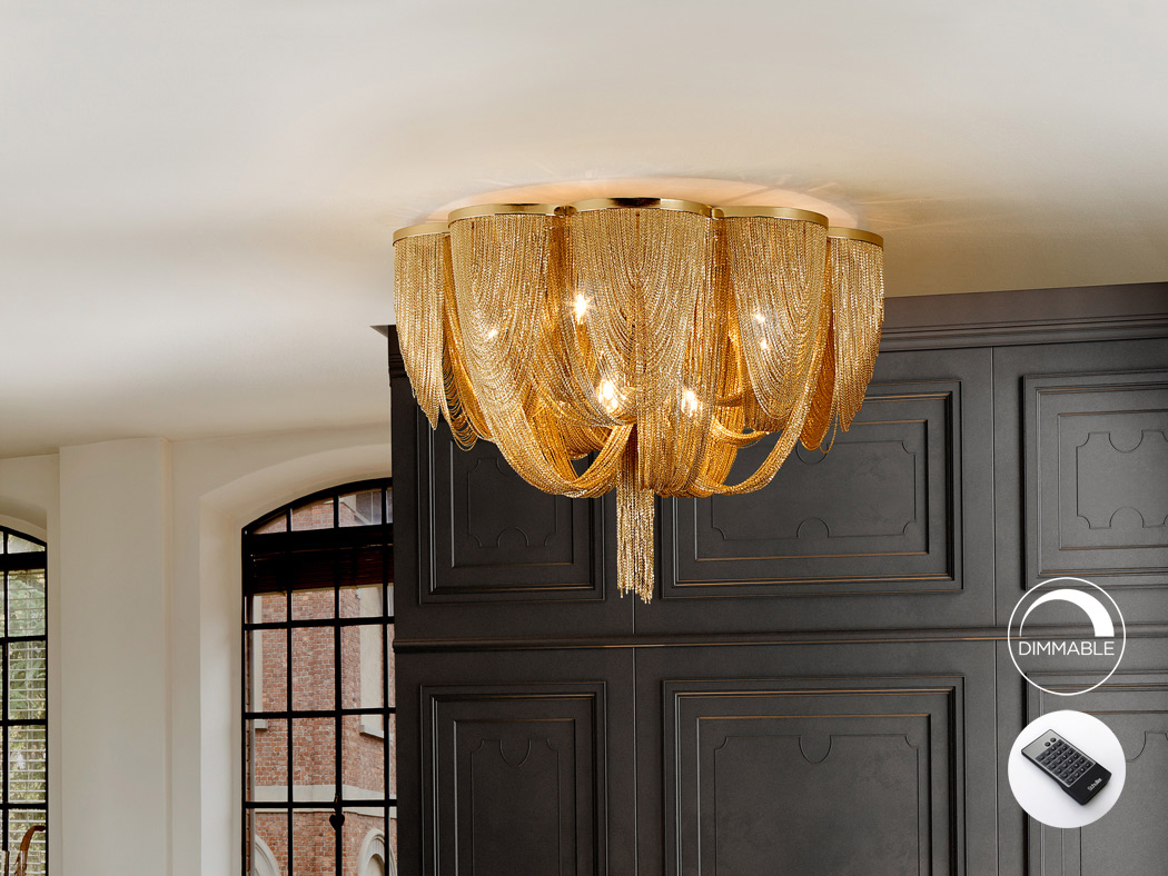 Plafonnier à 10 lumières, comprenant des chaînes fines en métal finition nickel qui forment le corps de la lampe. DIMMABLE. Télécommande incluse.