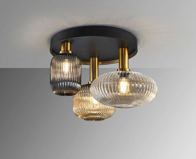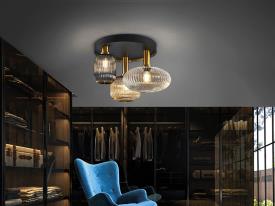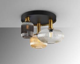 Plafonnier 3 lumières réalisé en métal finition en noir mat, avec des détails en laiton satiné. Tulipes en verre moulé finition transparente, ambre et gris smoke miroitant.