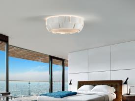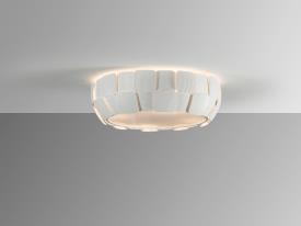Plafonnier avec tulipe composée par des plaques de polycarbonate à surface ondulée. Structure faite en métal, finition blanc cassé mat. Diffuseur inférieur.