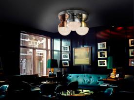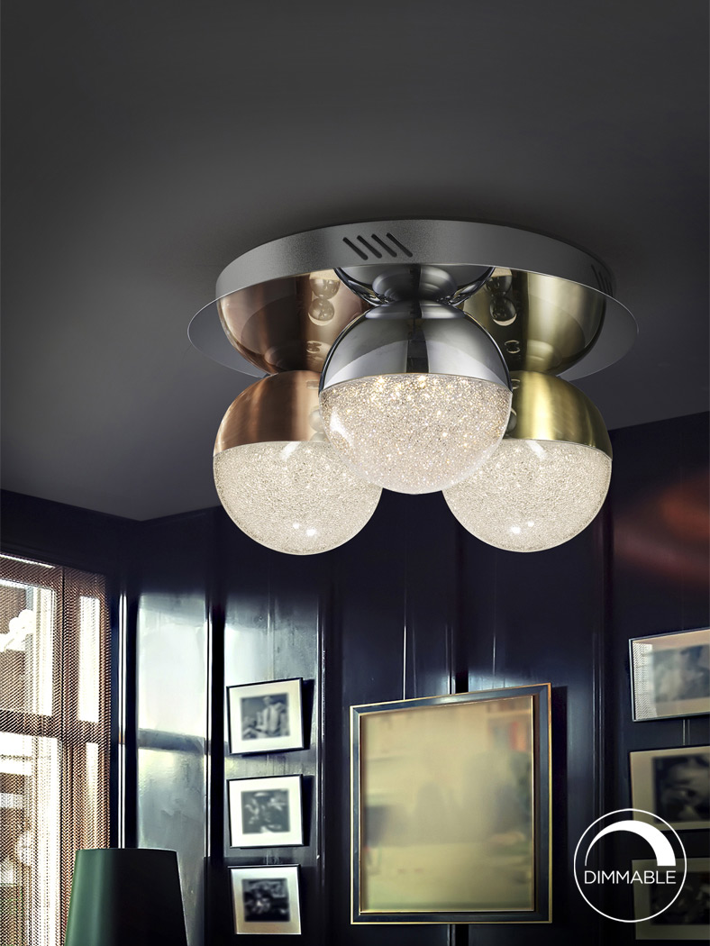 Plafonnier 3 lumières LED, réalisé en métal finition chrome. Tulipes sphériques de 12 cm en polycarbonate avec intérieur texturé et métal finition en cuivre satiné, laiton satiné et chrome. 14,4W LED, 3.000 K, 1.000 lm, DIMMABLE.