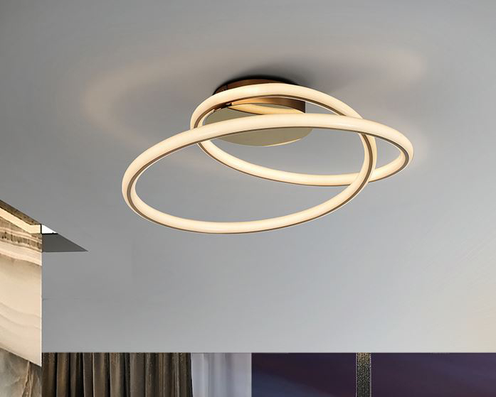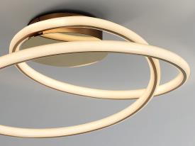 Plafonnier réalisé en métal et en aluminium. Finition or brillant et or mat. Diffuseur tubulaire en silicone opale. 44W LED. 3.520 lm. 3.000K