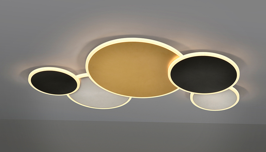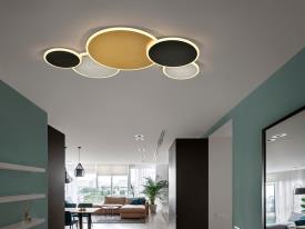 Plafonnier en métal et aluminium, finition or, blanc et noir mat. Diffuseur acrylique opale. 48W, 2.800lm, 3.000K. REGLABLE EN INTENSITÉ.