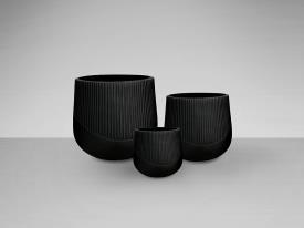 Set de trois pots de leurs en fibre de verre et résine Fiberclay, finition noire. Utilisation à l'intérieur et à l'extérieur. Grand Ø44x41cm. Moyen. Ø34x31cm. Petit Ø24x21cm.
