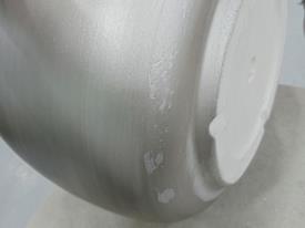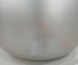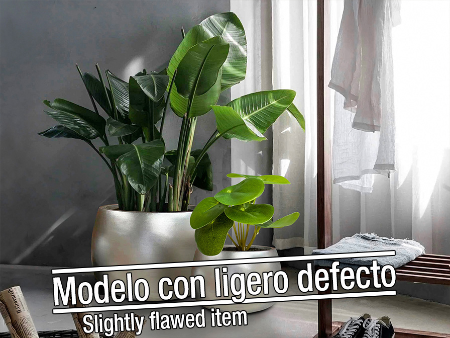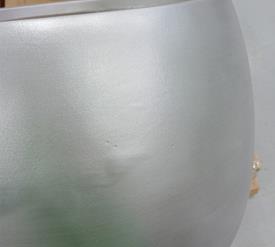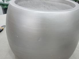 Lot de deux jardinières en fibre de verre et résine Fiberclay, finition argent vieilli. Grande : Ø 47 x 35 cm. Petite : Ø 34 x 25 cm. Défauts : plusieurs petites imperfections dans la finition argentée des pots.