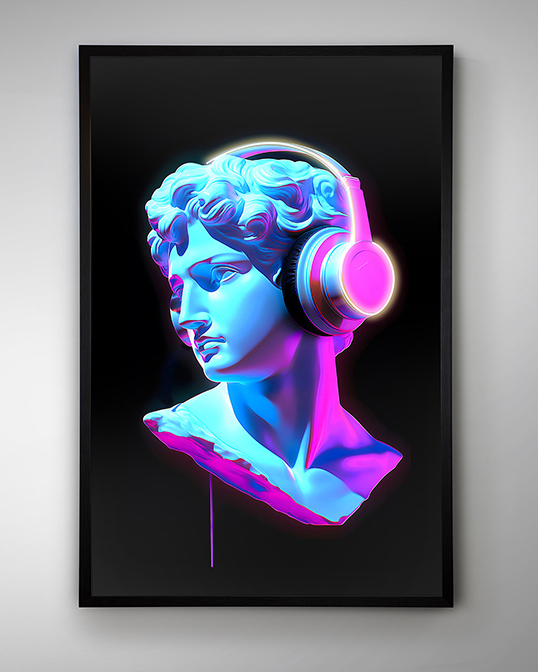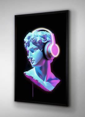 Buste classique coloré avec écouteurs, composition avec bande LED décorative. Toile imprimée, collée sur carton et encadrée en noir.