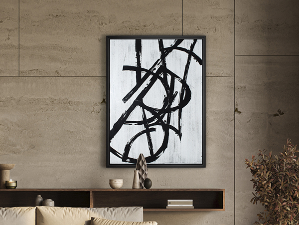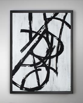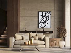Composition graphique. Verre imprimé, sur papier texturé et base en MDF. Cadre en polystyrène blanc.