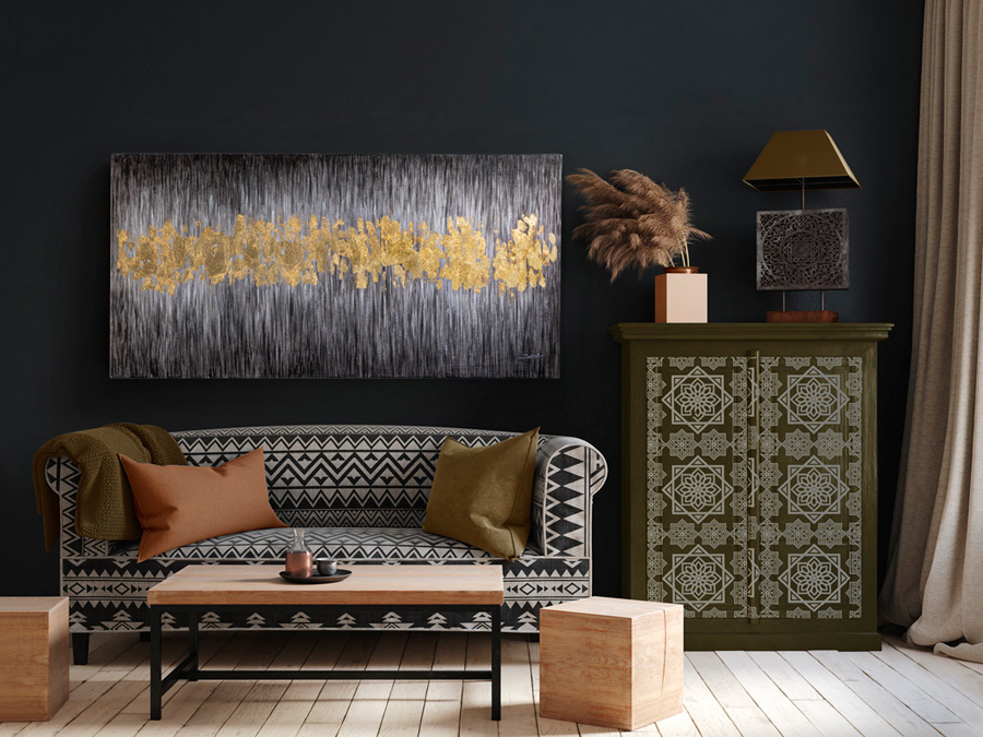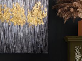 ACRYLIQUE·SENDERO·80X160 Dimensions : l 160 x h 80 x p 4 cm SENDERO· Peinture acrylique avec applications de FEUILLE D’OR, sur cadre. Matériau: Acrylic painting on canvas tableau