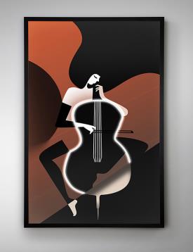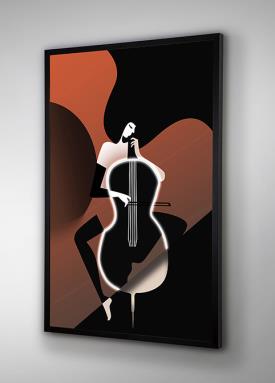 Femme abstraite avec violoncelle, composition avec bande lumineuse LED décorative. Toile imprimée, collée sur carton et encadrée en noir.