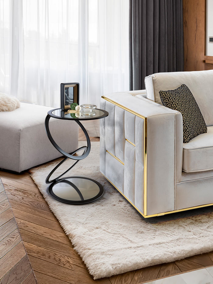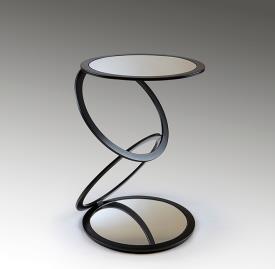 Table auxiliaire ronde, en acier, finition noir mat. Dessus et étagère inférieure en miroir de 6 mm.