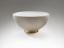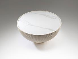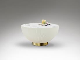 Table basse ronde, tapissée en éco-cuir plissé blanc, base en métal avec finition en laiton et dessus en pierre frittée imitant le marbre blanc.