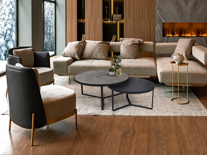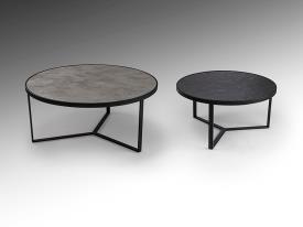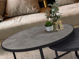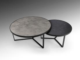 Paire de tables d'appoint en métal, finition noir mat. Plateau en MDF avec surface en mélamine haute résistance, finition pierre grise et noire.