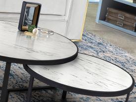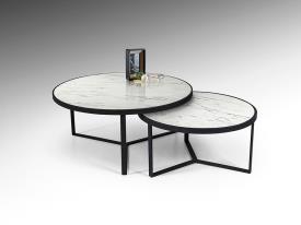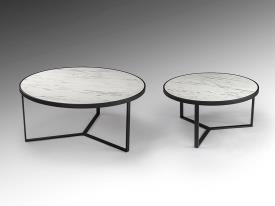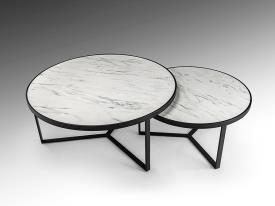 Paire de tables d'appoint en métal, finition noir mat. Plateau en MDF avec surface en mélamine haute résistance, finition marbre blanc brillant.
