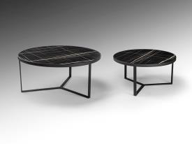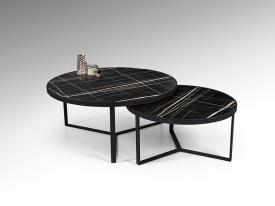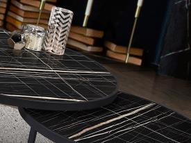Paire de tables d'appoint en métal, finition noir mat. Plateau en MDF avec surface en mélamine haute résistance, finition marbre noir brillant.
