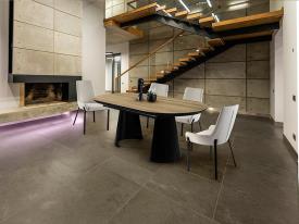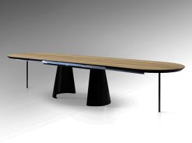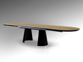 table de salle à manger extensible, en métal, finition noir mat et plateau en MDF avec surface en mélamine haute résistance, finition bois, avec coins noirs mats. Extensible jusqu'à 4 mètres.