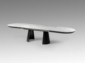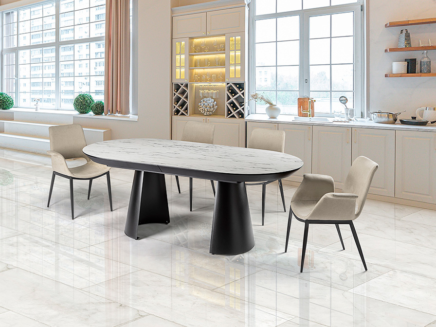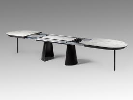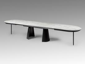 table de salle à manger à rallonge, en métal avec finition noire mate et plateau en MDF avec surface en mélamine haute résistance, finition marbre blanc brillant, avec coins noirs mats. 4 mètres à rallonge.