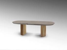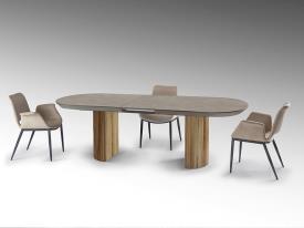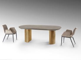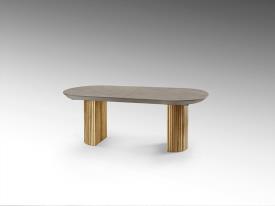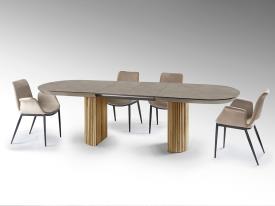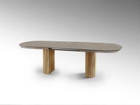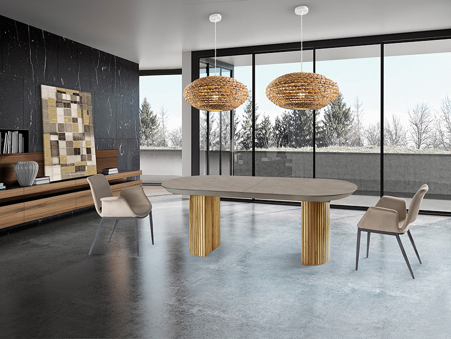 table de salle à manger à rallonge, structure en MDF, pieds avec surface rainurée, finition bois. Plateau en MDF avec surface en mélamine haute résistance, finition pierre mate, avec chants assortis. Extensible jusqu'à 286 cm.