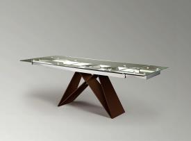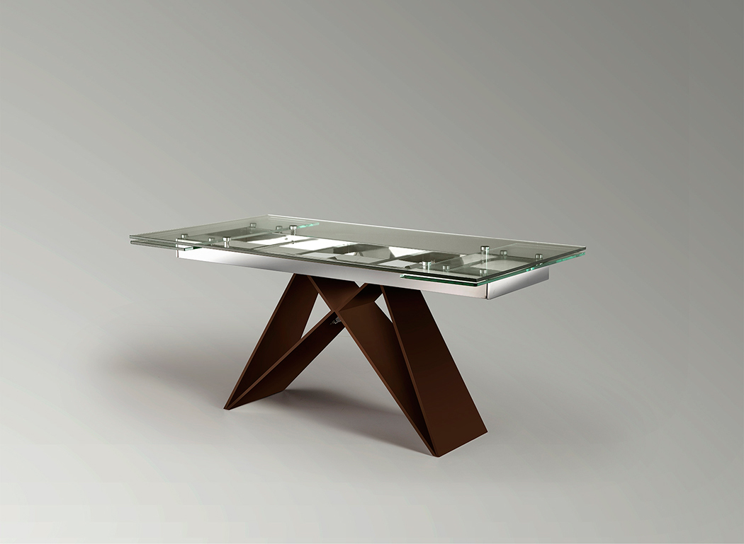 table de salle à manger à rallonge 160/220 cm, en acier inoxydable, finition brillante et base en brun rouille foncé. Dessus en verre de sécurité de 12 mm d'épaisseur avec bord poli.