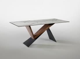 table de salle à manger réalisée en métal, laquée en noir mat, et bois de noyer. Dessus laminé en grès porcelainé et verre, avec décoration marbre blanc, finition brillante.