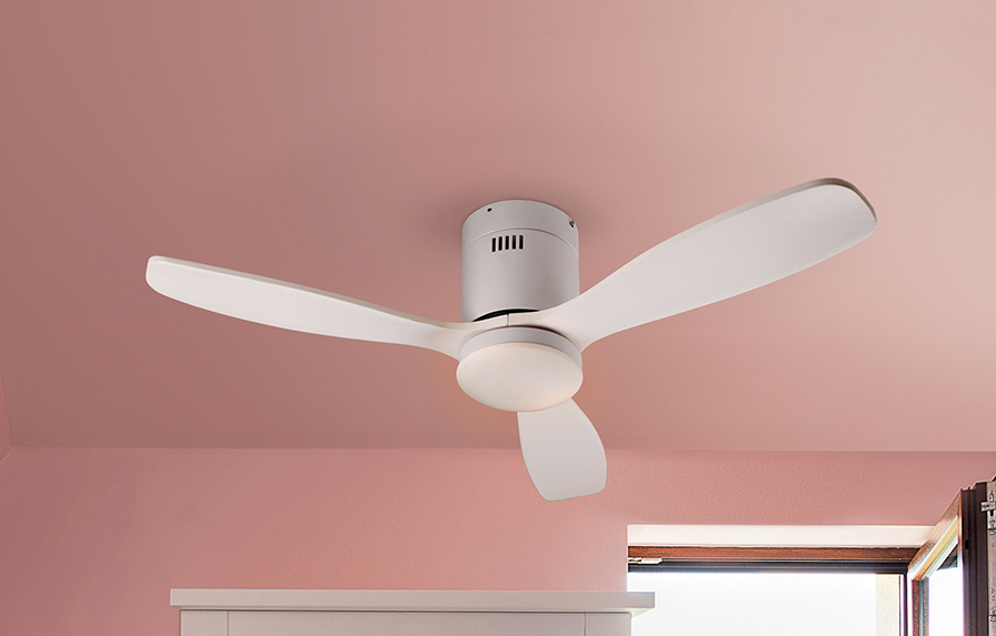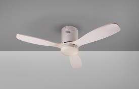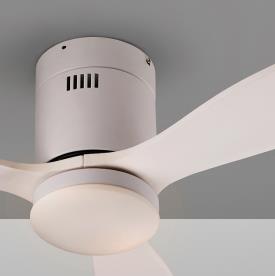 ventilateur de plafond avec lumière LED DIMABLE CCT. Réalisé en métal avec pales en bois, finition en blanc, diffuseur en verre opale. Ventilateur avec moteur dc à 6 vitesses et inversion. 3 tons de température de couleur, minuteur. Télécommande inclu