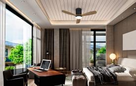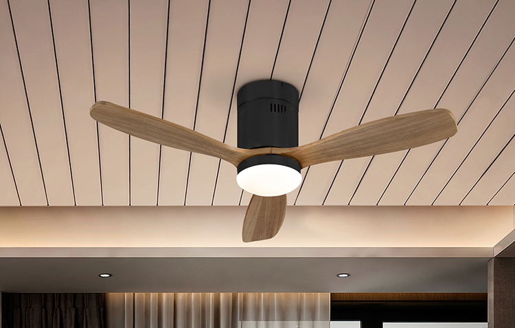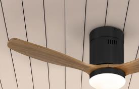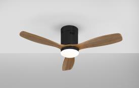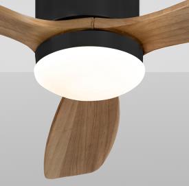 ventilateur de plafond avec lumière LED DIMMABLE CCT réalisé en métal finition noir mat et pales en bois finition couleur noyer, diffuseur en verre opale. Ventilateur avec moteur dc à 6 vitesses et inversion. 3 tons de température de couleur. minuteu