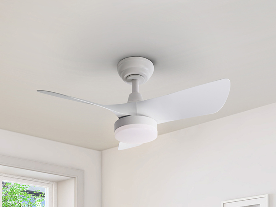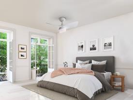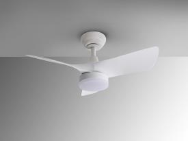 ventilateur de plafond avec éclairage LED DIMMABLE et CCT (température de lumière réglable). Réalisé en métal et pales en acrylique, finition blanc mat. Diffuseur en acrylique opale. Moteur à courant continu, 6 vitesses et inversion. Minuterie, fonction