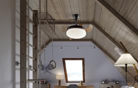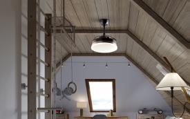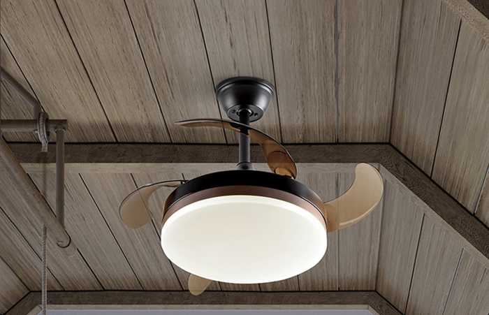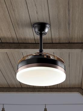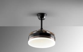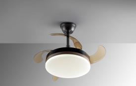 ventilateur de plafond avec lumière LED DIMMABLE CCT en métal finition noir mat et cerceau en bronze. Diffuseur opale et lames fumées rétractables, en acrylique. Moteur à courant continu 6 vitesses et inversion. Température de couleur réglable.