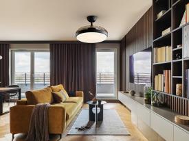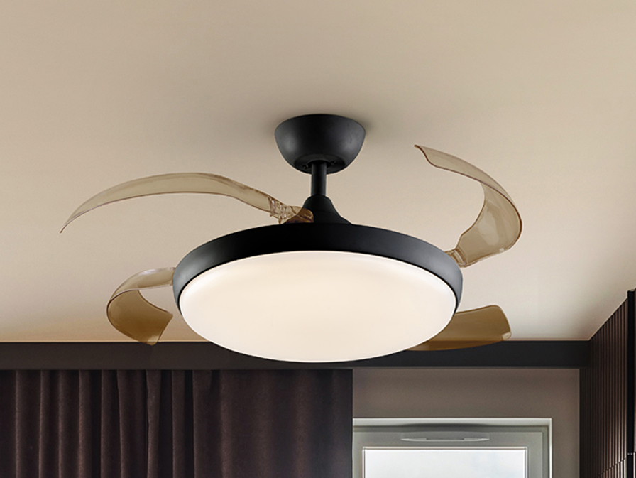 ventilateur de plafond, lumière LED DIMMABLE et CCT (température de lumière réglable), en métal finition noir mat, diffuseur en acrylique opale et pales rétractables fumées. Moteur à courant continu, 6 vitesses et inversion. Minuterie, fonction brise