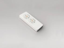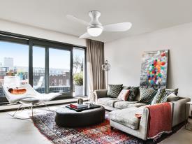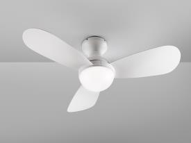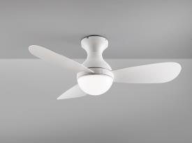 ventilateur de plafond lumière LED CCT réalisé en métal finition blanc mat et pales en acrylique blanc brillant, diffuseur acrylique opale, moteur dc à 6 vitesses et inversion. 3 températures de couleur, minuteur.